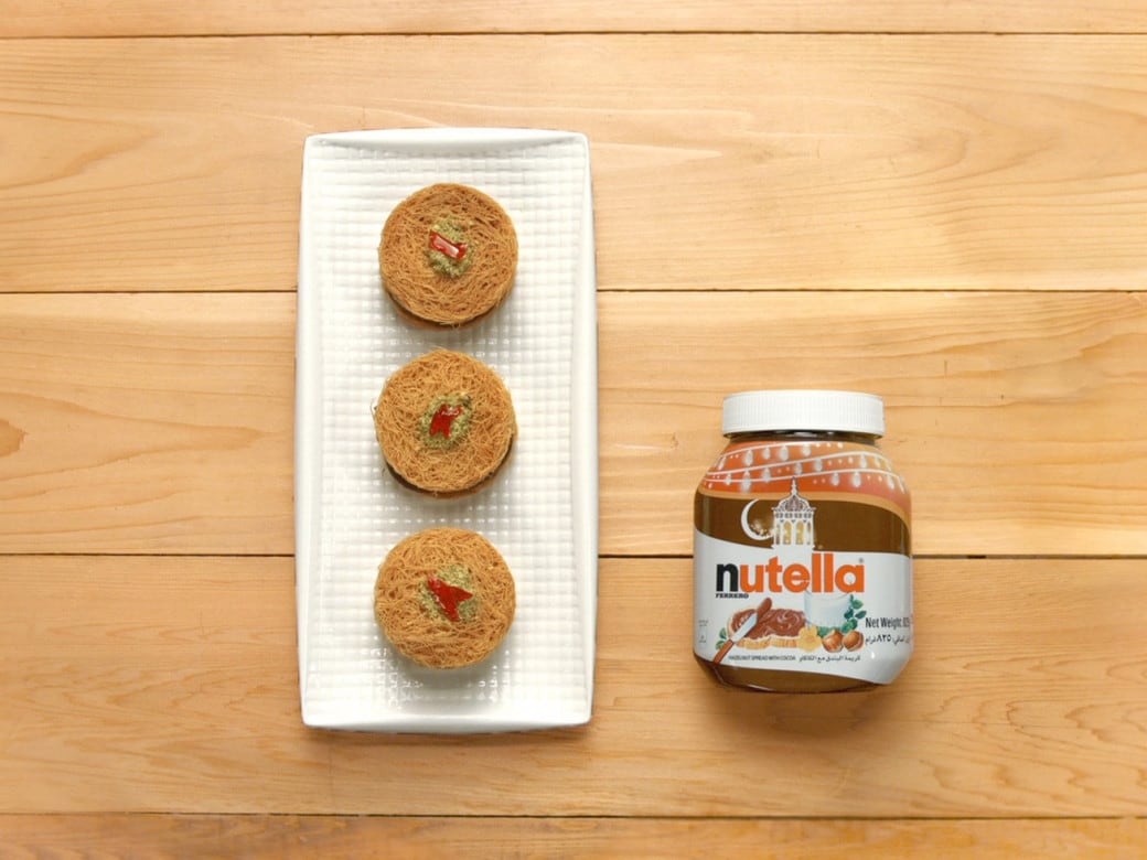 توضع نوتيلا في كيس تزيين، توزع نوتيلا على قرص من الكنافة ثم توضع فوقه قرص أخر.