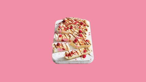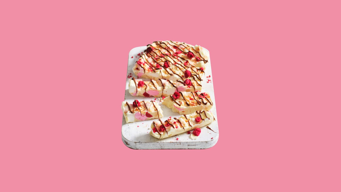 Once set, crush your freeze-dried raspberries and sprinkle on top of the slab. Drizzle with 15g of Nutella® then use a sharp warm knife (that has been run under hot water then dried) to cut into 6 slices, then cut each slice in half to create a serving.