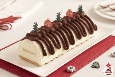 Sortez la bûche du moule et disposez-la sur une assiette. Réservez au frais. Avant de servir, remplissez une poche à douille avec du Nutella® et décorez la bûche.