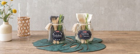 SCHRITT 2Befülle das Glas mit Serviette, Holzbesteck und Rosmarinzweig.