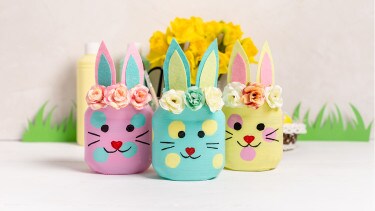 Um deinem Häschen nun noch den Feinschliff zu geben, kannst du drei kleine Kunstblumen als Blumenkranz am unteren Ende der Ohren befestigen. Dein Häschen-Sammelglas ist bereit, um bei dir einzuziehen oder um verschenkt zu werden!