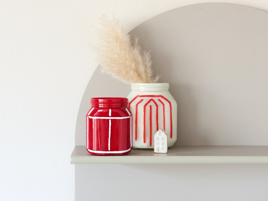 Male das Glas von innen mit Acrylfarbe an – entweder komplett rot oder im Wechsel rot/weiß.