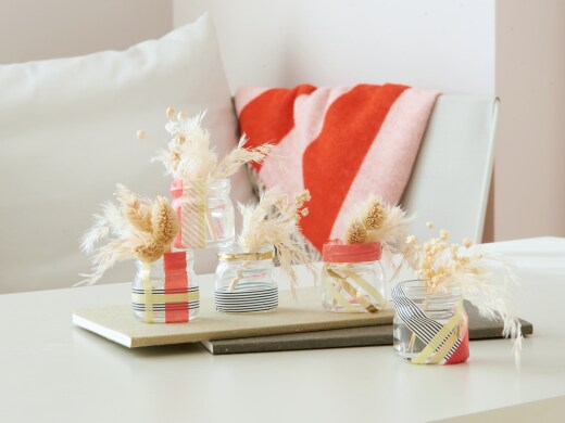 Klein aber oho! Verwandle deine nutella Minis in schicke Vasen, indem du sie mit buntem Washi Tape individuell verzierst. Perfekt für dein Zuhause oder als süßes Mitbringsel.