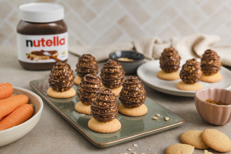 AnrichtenDie Mischung zu kleinen Kugeln in Ostereierform rollen und auf einen Butterkeks legen. Kugeln für mindestens 30 Minuten im Kühlschrank ruhen lassen, damit sie etwas fester werden. Kugeln aus dem Kühlschrank nehmen und mit nutella® dekorieren, dazu einen Spritzbeutel verwenden.