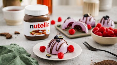 SCHRITT 4Die Mousse Törtchen aus der Form lösen und auf einem Blech oder Kuchengitter circa 30 Minuten auftauen lassen. Dann mit nutella® und frischen Beeren garnieren.