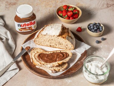 Sobald das Brot vollständig abgekühlt ist, in Scheiben schneiden und mit 15 g nutella® pro Portion bestreichen.