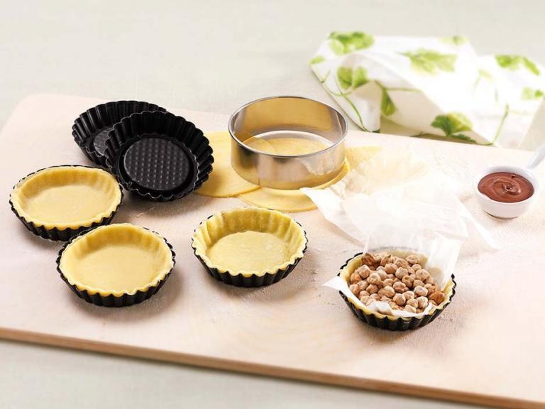 Distribuye la masa en los moldes engrasados y enharinados. Para evitar que se hinche excesivamente, pincha la masa varias veces con un tenedor. Precalienta el horno a 180 °C y hornea las tartaletas durante 8-10 minutos. Después, desmolda y deja que se enfríen. Rellena las tartaletas con Nutella® y ya las puedes servir.