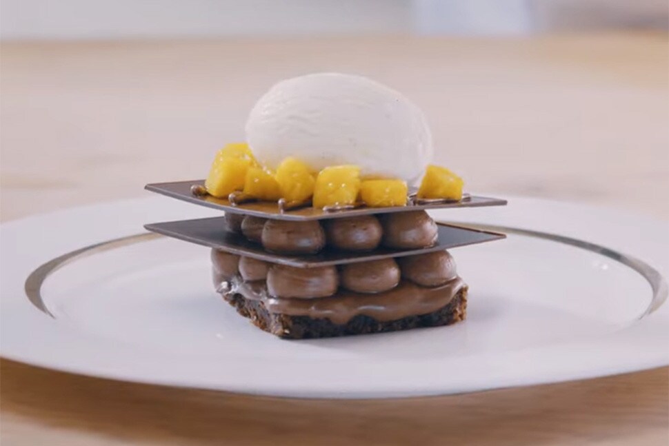 C’est l’heure de l’assemblage ! Coupez votre brownie puis disposez-le dans une assiette. Nappez-le de Nutella® puis pochez votre ganache chocolat par-dessus. Disposez une feuille de chocolat sur votre ganache, puis répétez l’opération. Sur votre dernière feuille de chocolat, pochez finement du Nutella®, puis ajoutez une quenelle de glace, ainsi que des morceaux de mangue.