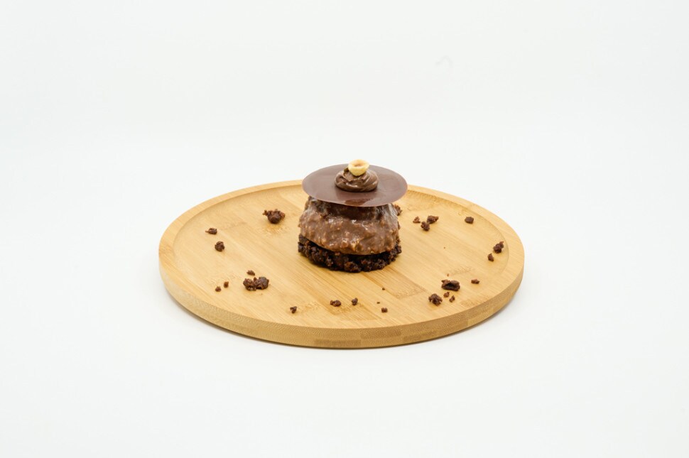 Disposer un cercle de biscuit au cacao dans le fond de l’assiette. Ajouter deux palets de gelée de cassis de part d'autre.