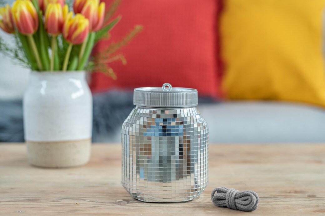 ÉTAPE 5Après séchage, collez les pierres de mosaïque (miroir) sur le verre du pot Nutella®.