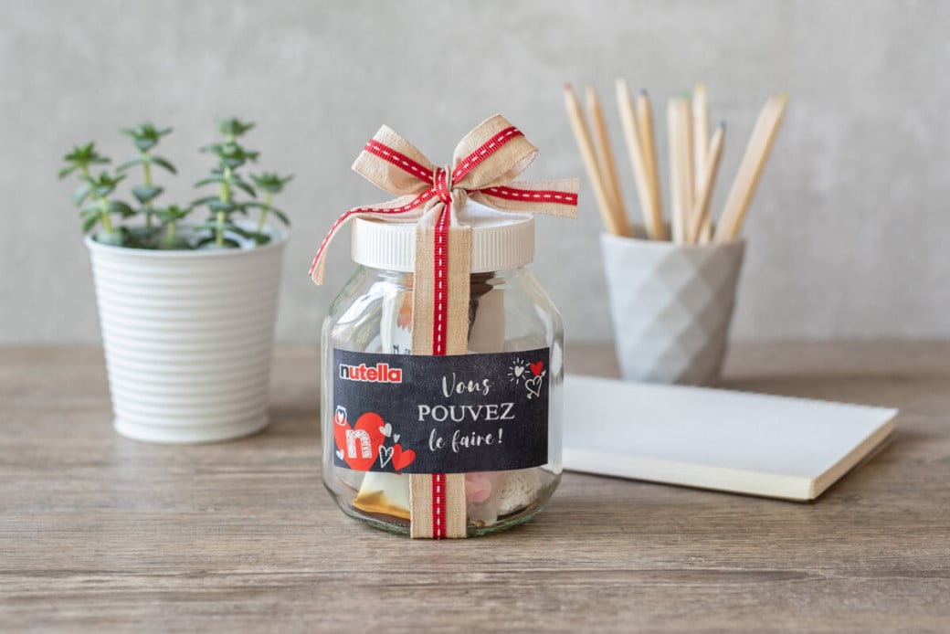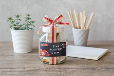 ÉTAPE 4Fermez le couvercle, attachez le ruban autour du pot Nutella® rempli et collez l'autocollant de tableau noir avec l'inscription «Vous pouvez le faire !» Sur la face du pot.