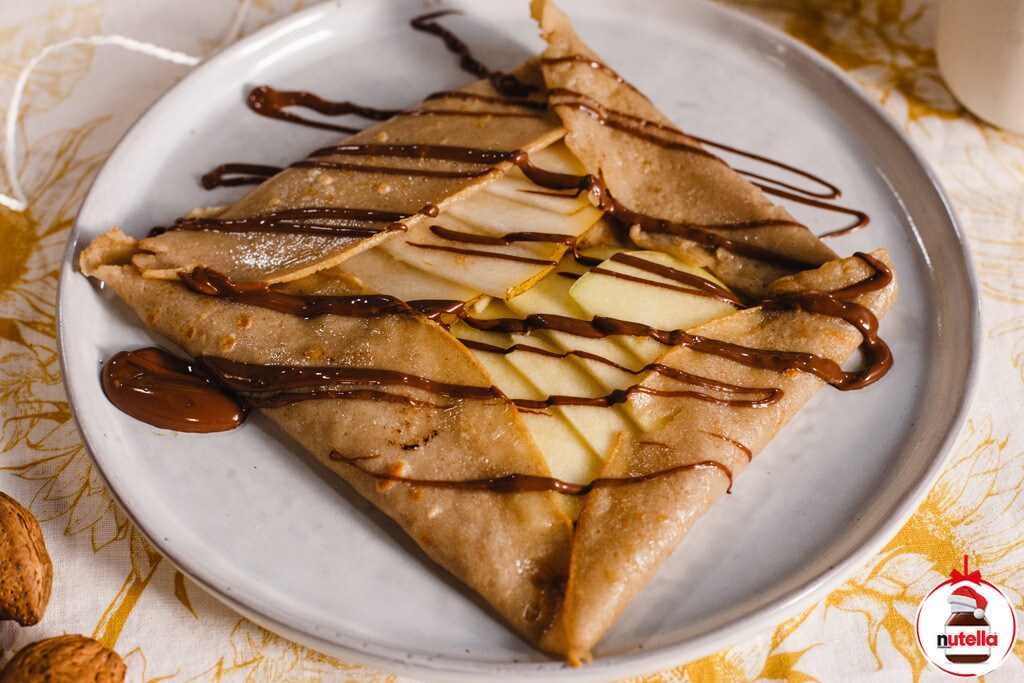 Az almát és a körtét nagyon vékony szeletekre vágjuk. Egy serpenyőben kevés olajat és vajat olvasztunk. Kisütünk rajta egy palacsintát, majd amikor megfordítjuk, elrendezzük rajta az alma és körteszeletek egynegyedét. Ráhajtjuk a töltelékre a palacsinta széleit és tányérra csúsztatjuk. Meglocsoljuk egy kevés Nutella®-val és azonnal tálaljuk. A többi palacsintát ugyanígy kisütjük.