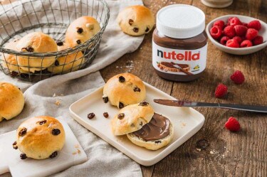 A zsemléket félbevágjuk, és 15 g Nutella®-val megkenjük.