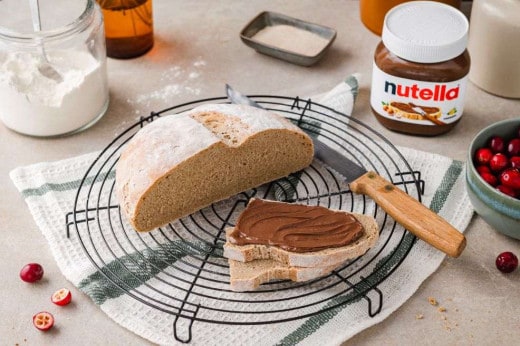 Amint a kenyér teljesen kihűlt, szeleteld fel, és kend meg adagonként 15 g Nutella®-val.