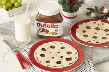 - Намажьте Nutella® на каждый целый лаваш и сверху выложите лаваши с вырезанными фигурами, образуя форму снежинки.