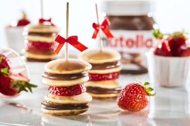 Nu hoef je alleen nog maar je pannenkoekjes samen te stellen. Doe Nutella® in een spuitzak met een gladde spuitmond. Neem een van de schijfjes, spuit ongeveer 2,5g Nutella® uit en leg er nog een pannenkoekje bovenop. Leg dan een partje aardbei op de pannenkoekjes, spuit nog een keer 2,5g Nutella® op dat pannenkoekje en leg er weer een ander schijfje bovenop. Garneer 5g Nutella® op het bovenste pannenkoekje als decoratie.