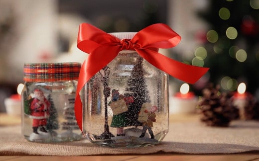 KROK 1Przyklej każdą figurkę do spodu wewnątrz pustego słoika po kremie Nutella® i obsyp figurki sztucznym śniegiem.