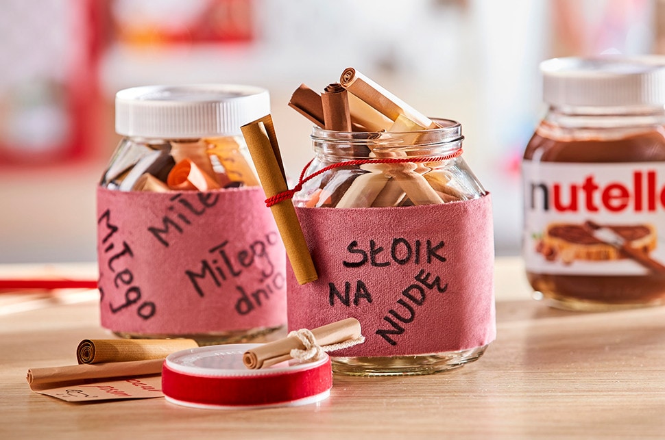 Do wykonania tego pomysłu potrzebujesz pustego słoika po kremie Nutella®. Przed rozpoczęciem prac pamiętaj o usunięciu etykiety.