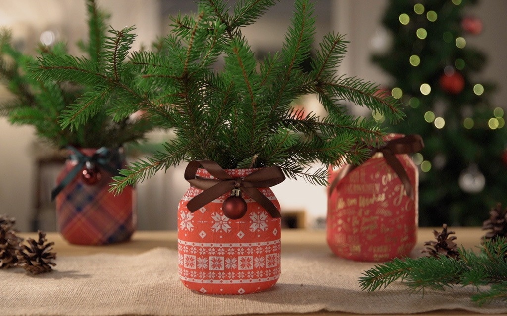 KROK 2Udekoruj słoik wstążką nawlekając na nią mini bombki. Umieść gałązki choinki w słoiku.