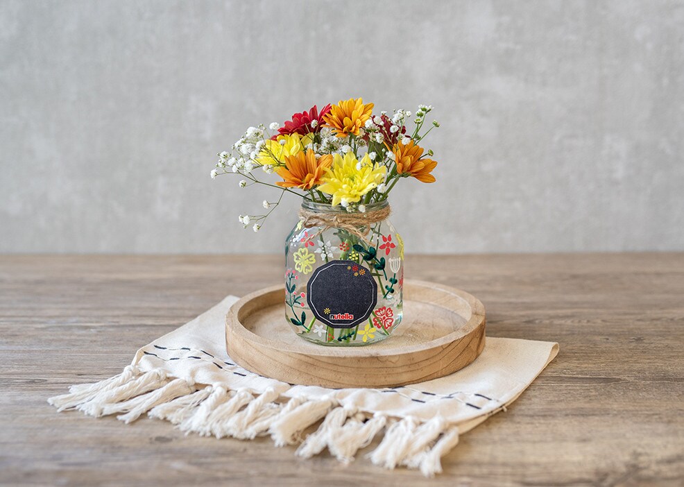 Jüt halatı nutella® kavanozunun üst kenarına sarın ve bir fiyonk yapın. Etiketin üzerine "Senin için" yazın, kavanoza yapıştırın ve kavanozu çiçeklerle doldurun.