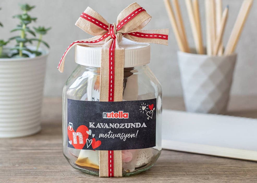 Kapağı kapatın, içi dolu Nutella® kavanozunun etrafına kurdela bağlayın ve üzerine “Yapabilirsin !” etiketi yapıştırın.