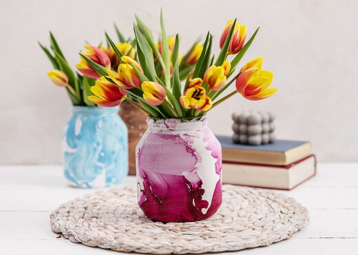 Astarlanmış kavanozunuzu bir kez suya batırın ve sonra tekrar kaldırın. Boyanın kurumasını bekleyin. Kuruduktan sonra, ebruli vazonuz bitmiştir ve en sevdiğiniz çiçekleri koymaya hazırdır!