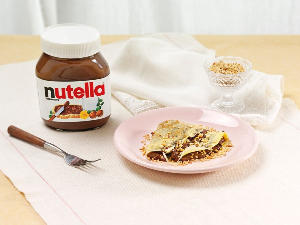 在每片可麗餅抹上能多益®榛果可可醬,再折起來形成扇子狀。大略切碎榛果,將可麗餅盛盤,再以碎榛果裝飾即可上桌。