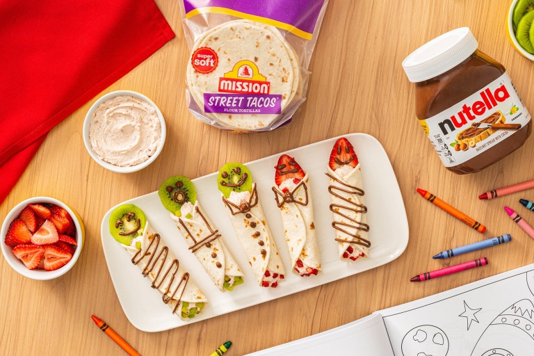 Transfer Nutella® Hazelnut Spread to piping bag fitted with small round tip. Pipe each fruit “head” with hazelnut spread to resemble a face. Pipe tops of tortillas as desired.